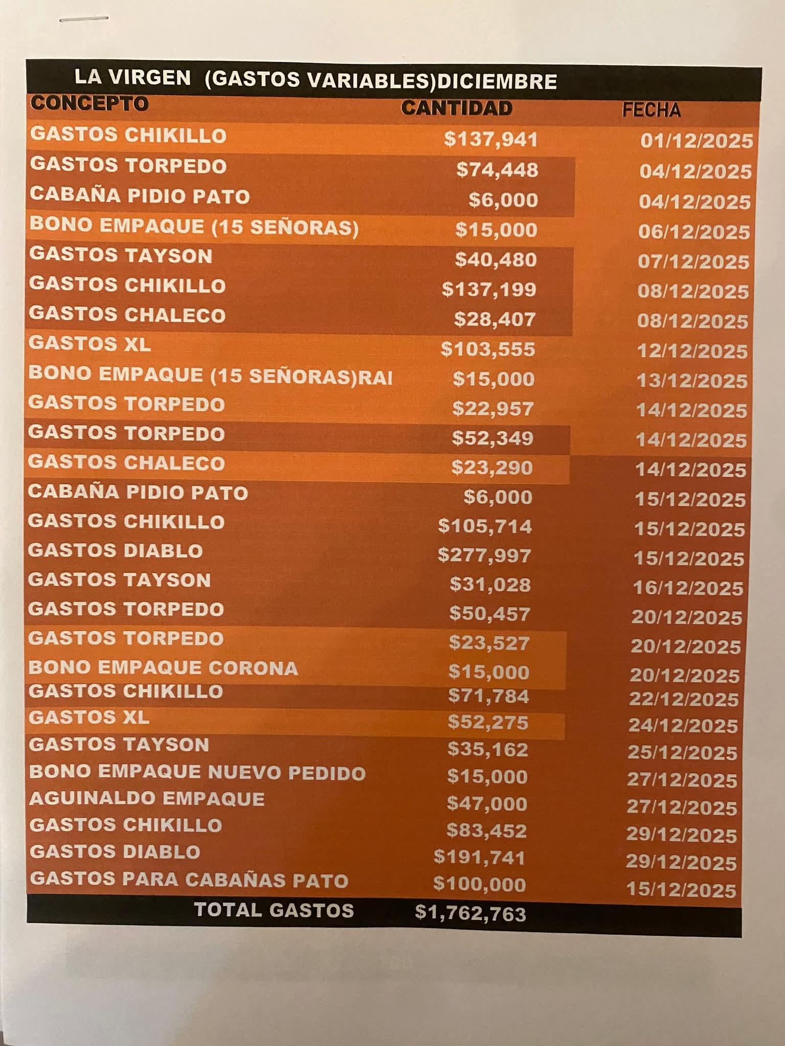 Los montos más altos se concentraron en alias como “Diablo”, “Chikillo” y “Torpedo”, pero también aparecen bonos y aguinaldo para un grupo identificado como “15 señoras” dedicadas al empaque, esto refuerza la idea de una estructura que combina operación armada y base social.