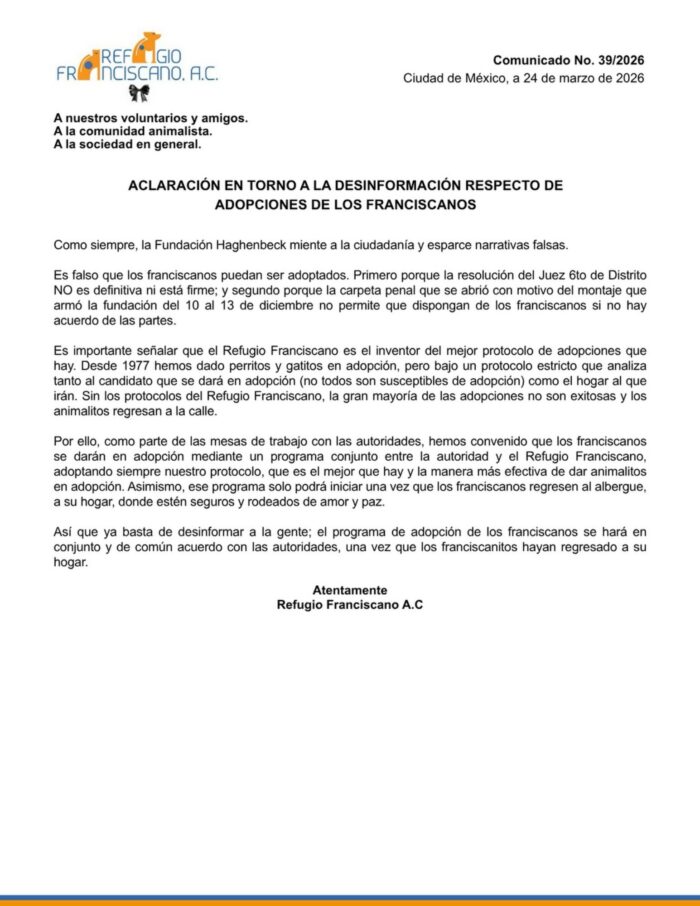 Mientras la fundación afirma que existe un respaldo judicial para que el Gobierno de la Ciudad de Mexico proceda con la entrega de los ejemplares a nuevos hogares, los franciscanos sostienen que el proceso legal aún no concluye y que cualquier programa de adopción debe contar con su intervención directa.