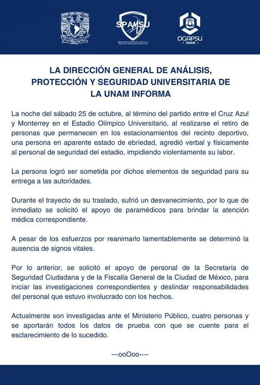 De acuerdo con el comunicado oficial de la Dirección General de Análisis, Protección y Seguridad Universitaria de la UNAM, el incidente ocurrió cuando el aficionado, presuntamente en estado de ebriedad, agredió verbal y físicamente al personal de seguridad, mientras se realizaba el retiro de personas que permanecían en los estacionamientos del recinto.