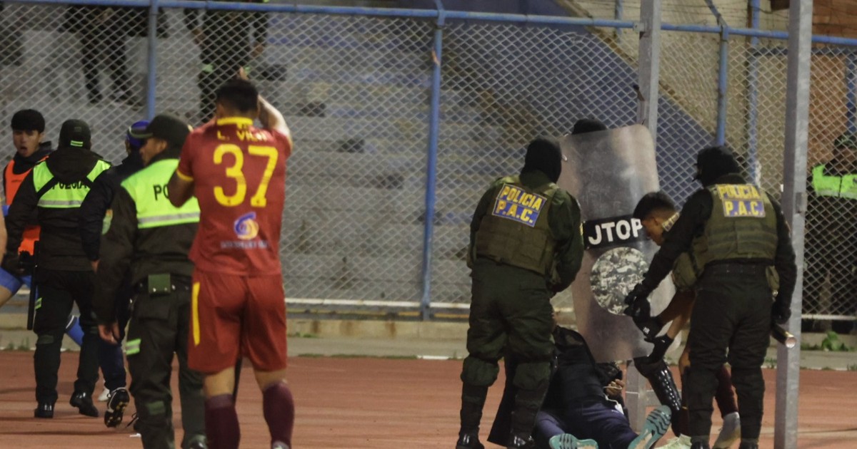 El partido entre Real Oruro y Blooming de Santa Cruz terminó con una monumental pelea que obligó la intervención de la policía y el uso de gas pimienta; el saldo de la bronca 17 expulsados entre jugadores y cuerpo técnico de ambos equipos.