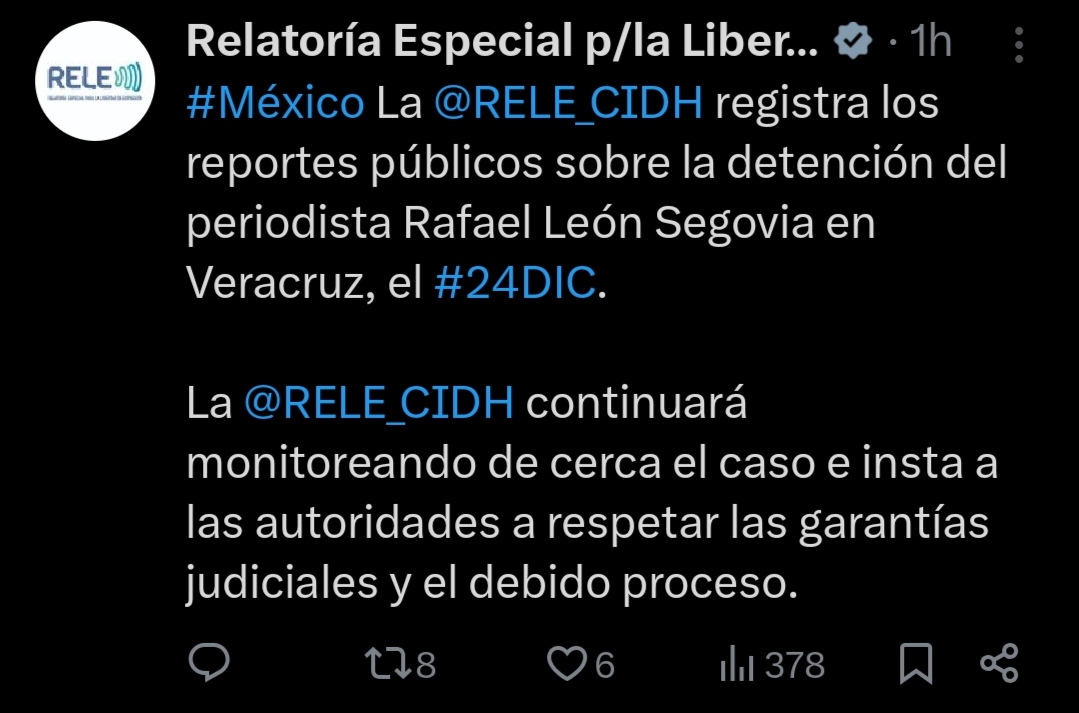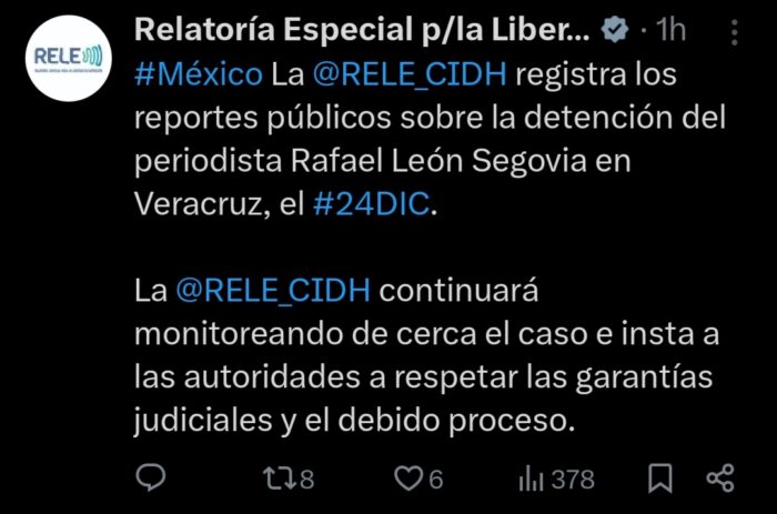 La RELE_CIDH registra los reportes públicos sobre la detención del periodista Rafael León Segovia en Veracruz, el 24 de diciembre. La RELE_CIDH continuará monitoreando de cerca el caso e insta a las autoridades a respetar las garantías judiciales y el debido proceso.
