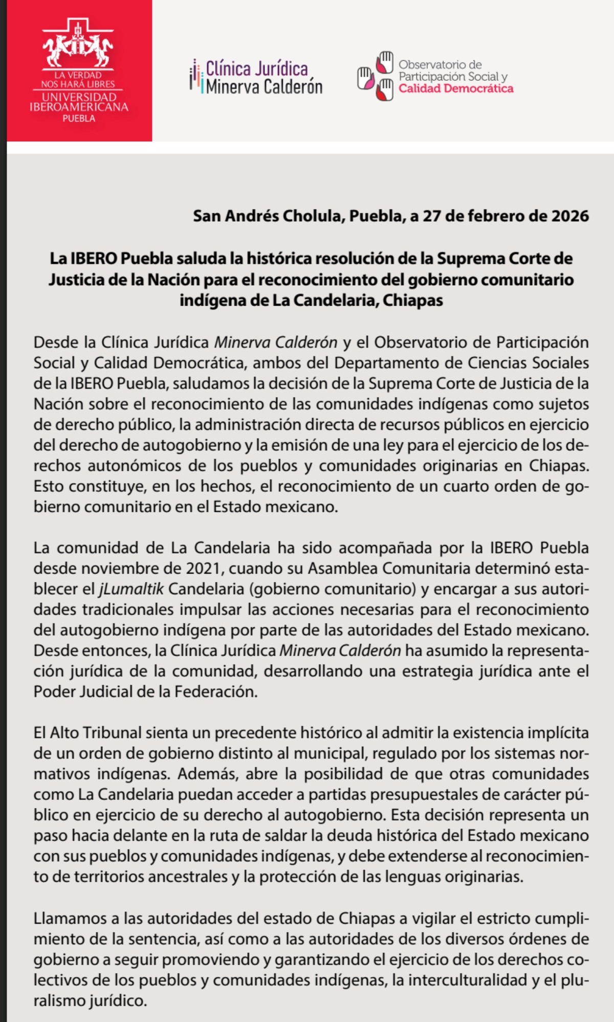 Con apoyo de la Clínica de Derechos Humanos “Minerva Calderón” de la Universidad Iberoamericana Campus Puebla, la Comunidad de La Candelaria continuó con el proceso legal para luchar por el reconocimiento a su gobierno.