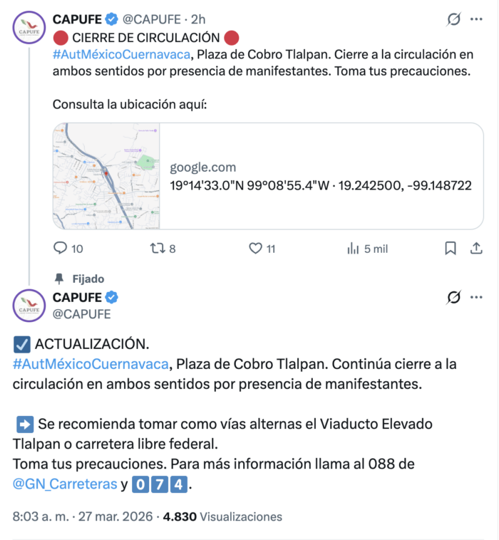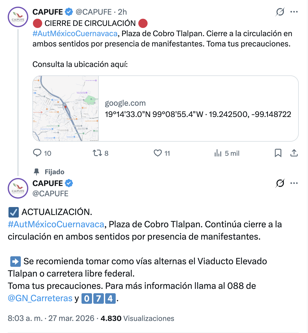 El cierre fue confirmado por Capufe, que señaló la presencia de manifestantes en la zona de la caseta Tlalpan como causa de la suspensión del tránsito. Autoridades también indicaron que personal de seguridad se mantiene en el lugar para dar seguimiento a la situación y facilitar el diálogo.