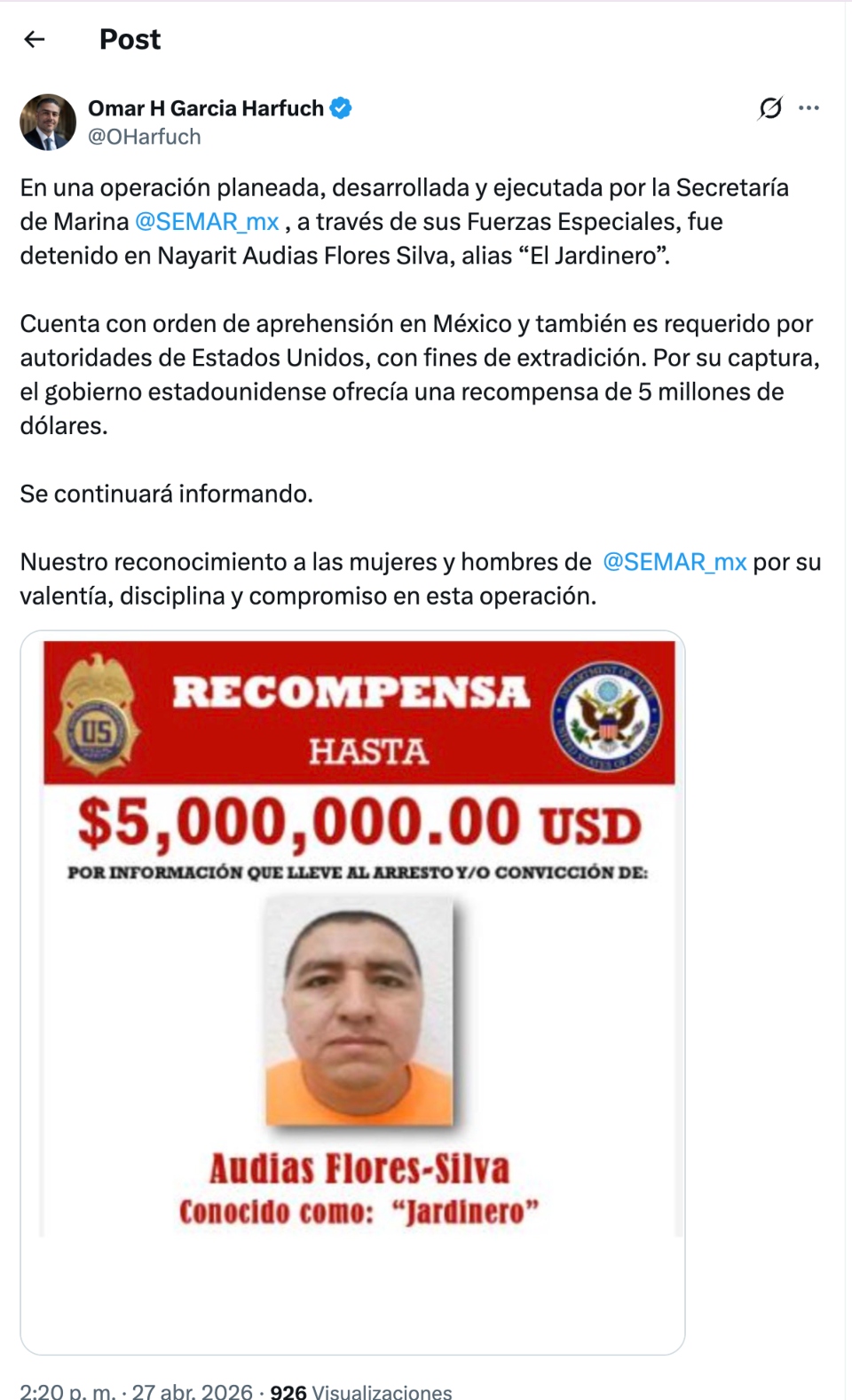 En una operación planeada, desarrollada y ejecutada por la Secretaría de Marina @SEMAR_mx, a través de sus Fuerzas Especiales, fue detenido en Nayarit Audias Flores Silva, alias “El Jardinero”.