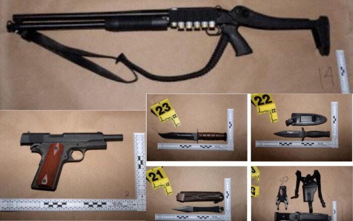 En particular, el sospechoso llevaba una escopeta de bombeo del calibre 12, una pistola semiautomática del calibre 38 y tres cuchillos, precisó la fiscal adjunta, Jocelyn Ballantine, por lo que pidió su “detención preventiva”.