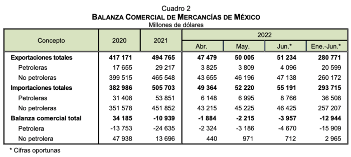 En cuanto a las exportaciones, en junio de 2022, alcanzaron 51 mil 234 millones de dólares, cifra integrada por 47 mil 138 millones de dólares de exportaciones no petroleras y por 4 mil 096 millones de dólares de petroleras.