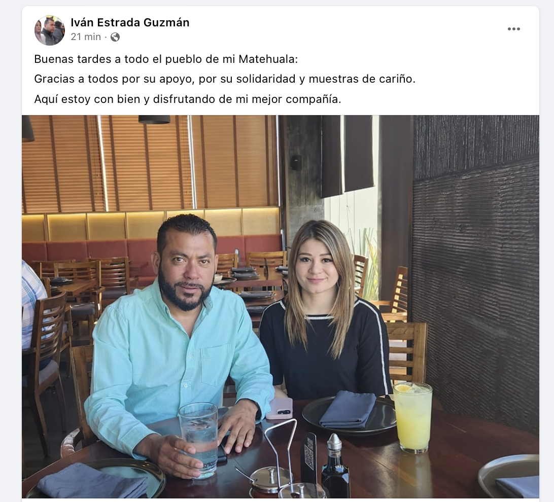 “Buenas tardes a todo el pueblo de mi Matehuala. Gracias a todos por su apoyo, por su solidaridad y muestras de cariño. Aquí estoy con bien y disfrutando de mi mejor compañía”.