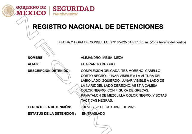 El Registro Nacional de Detenciones (RND) de la Secretaría de Seguridad y Protección Ciudadana (SSPC) recoge que Mejía fue detenido en Guerrero el pasado 23 de octubre.