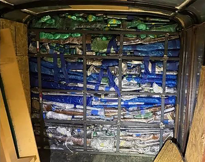 Durante la inspección, los oficiales encontraron más de 400 armas de fuego ocultas en compartimentos falsos. Según HSI Laredo, el arsenal incluía armas de diversos calibres, cargadores de alta capacidad y miles de municiones.