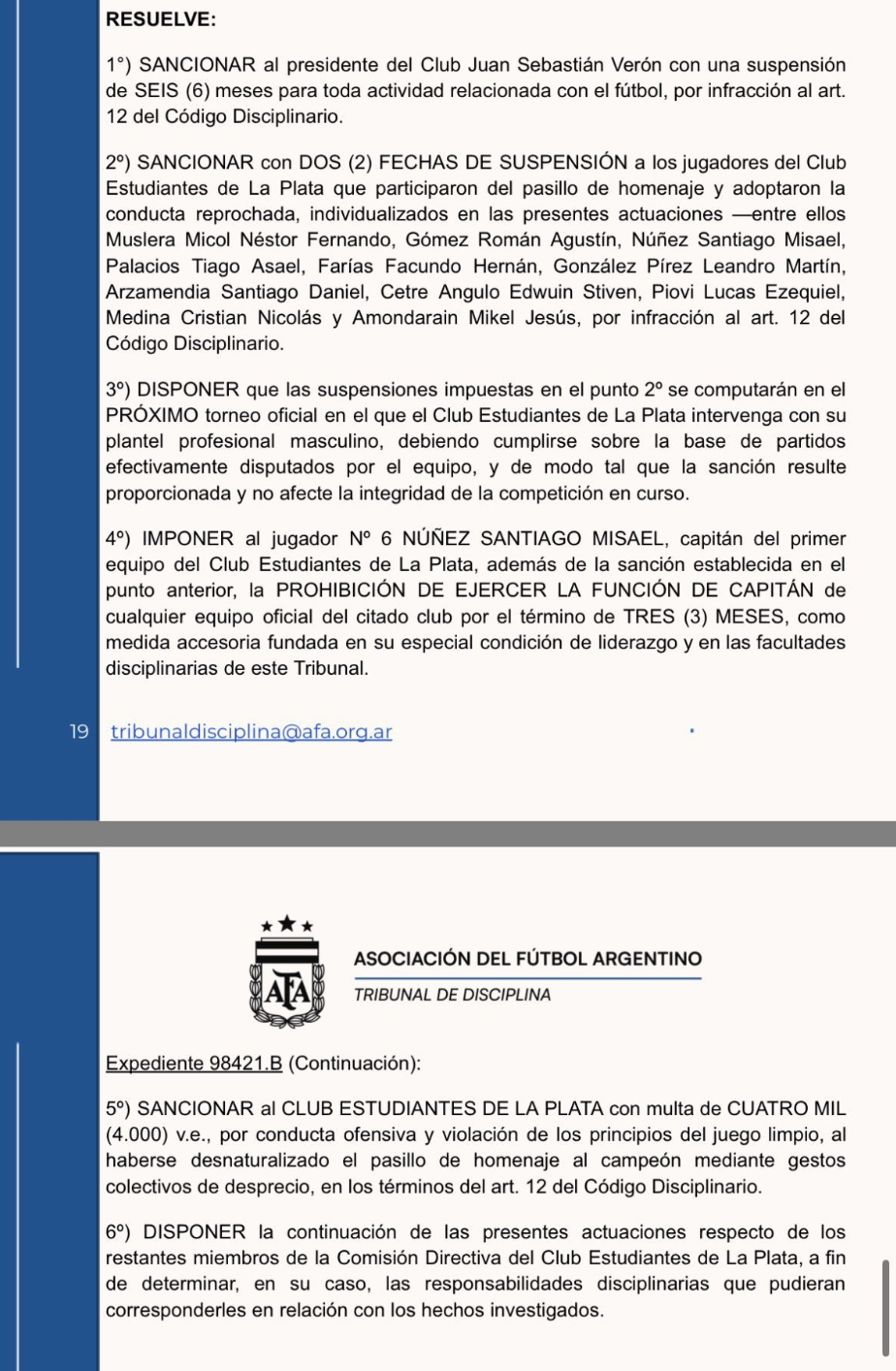 Verón, exinternacional argentino, recibió “una suspensión de seis meses para toda actividad relacionada al futbol“, mientras que los jugadores que “participaron del pasillo de homenaje y adoptaron la conducta reprochada” fueron suspendidos por dos fechas, de acuerdo al boletín del Tribunal de Disciplina.