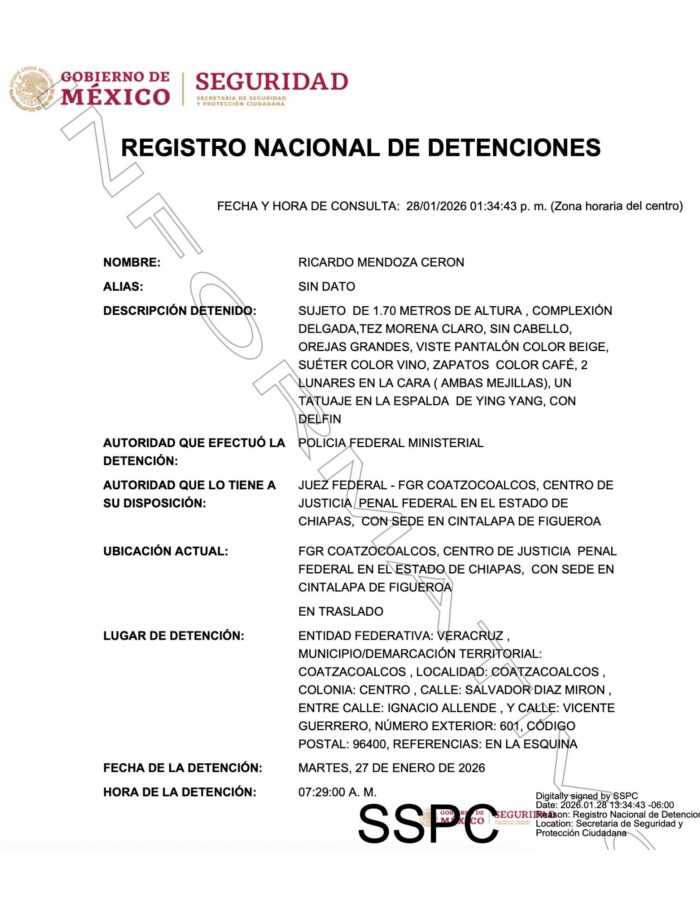 El Registro Nacional de Detenciones muestra que Mendoza Cerón fue arrestado en Coatzacoalcos, Veracruz, y después llevado al Centro de Justicia Penal Federal en el Estado de Chiapas con sede en Cintalapa de Figueroa.