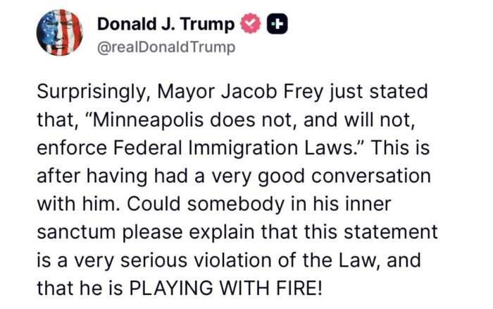 “Sorprendentemente, el alcalde Jacob Frey acaba de declarar que ‘Minneapolis no aplica ni aplicará las leyes federales de inmigración’. Esto después de haber mantenido una muy buena conversación con él”, escribió en sus redes sociales.