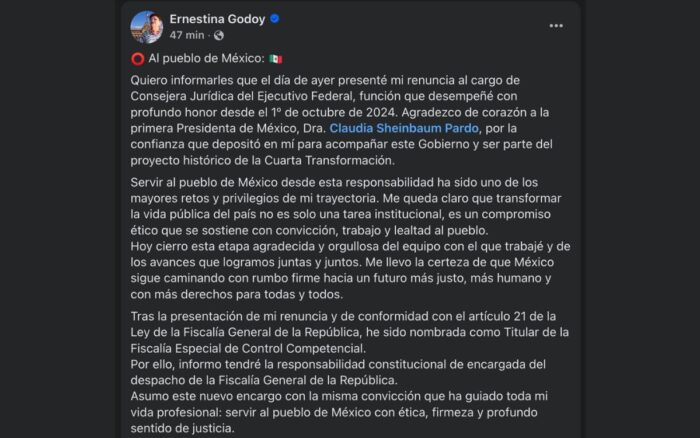 “Tendré la responsabilidad constitucional de encargada del despacho de la Fiscalía General de la República. Asumo este nuevo encargo con la misma convicción que ha guiado toda mi vida profesional: servir al pueblo de México con ética, firmeza y profundo sentido de justicia”, escribió Godoy sin aclarar los motivos que, a la vez, motivaron su renuncia a la Consejera Jurídica de la Presidencia.
