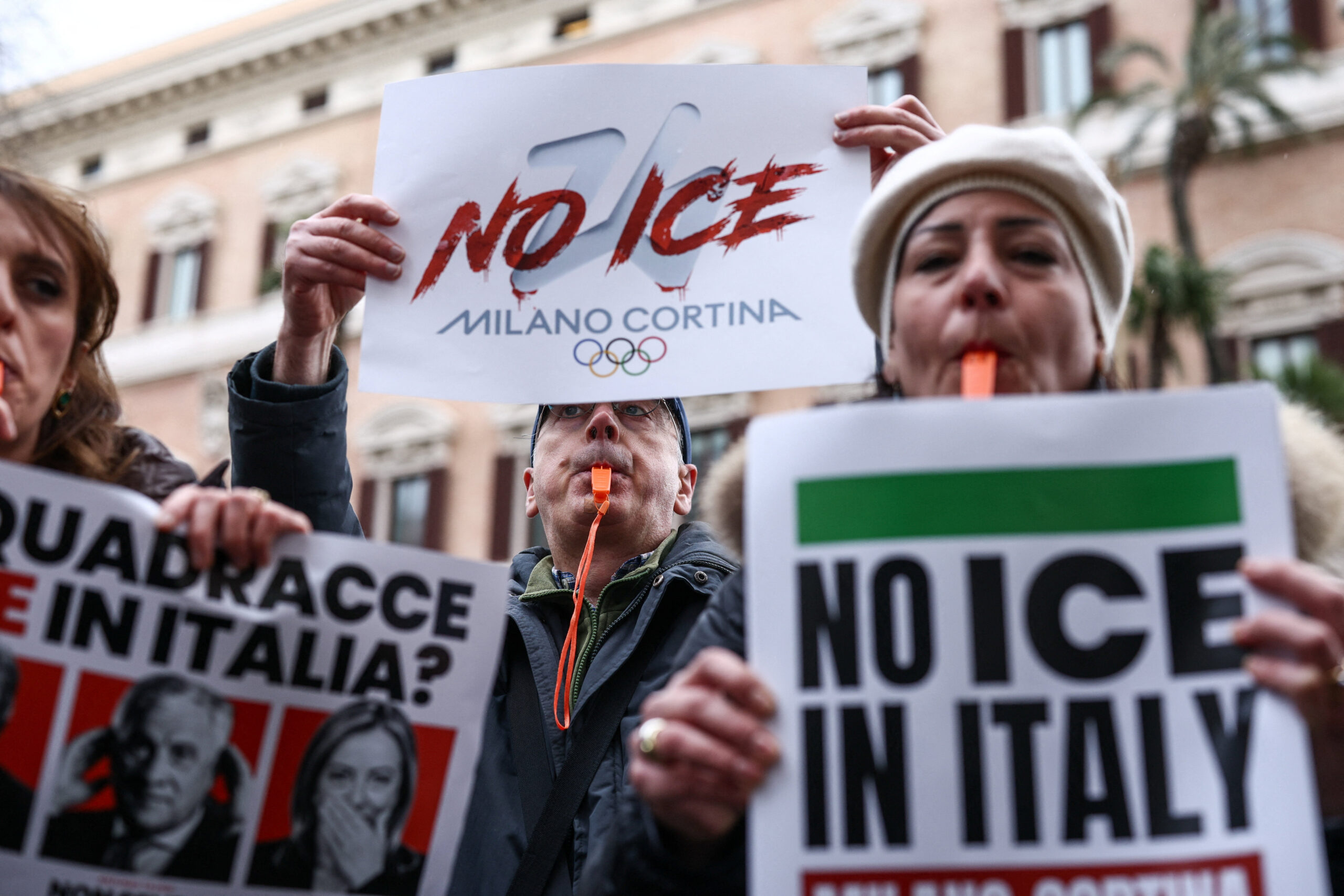 La concentración, convocada por el partido Más Europa, reunió a una quincena de personas que, al sonido de silbatos naranjas, portaron carteles con lemas como “No al ICE en Italia” y “Milán-Cortina no son tus Juegos”.