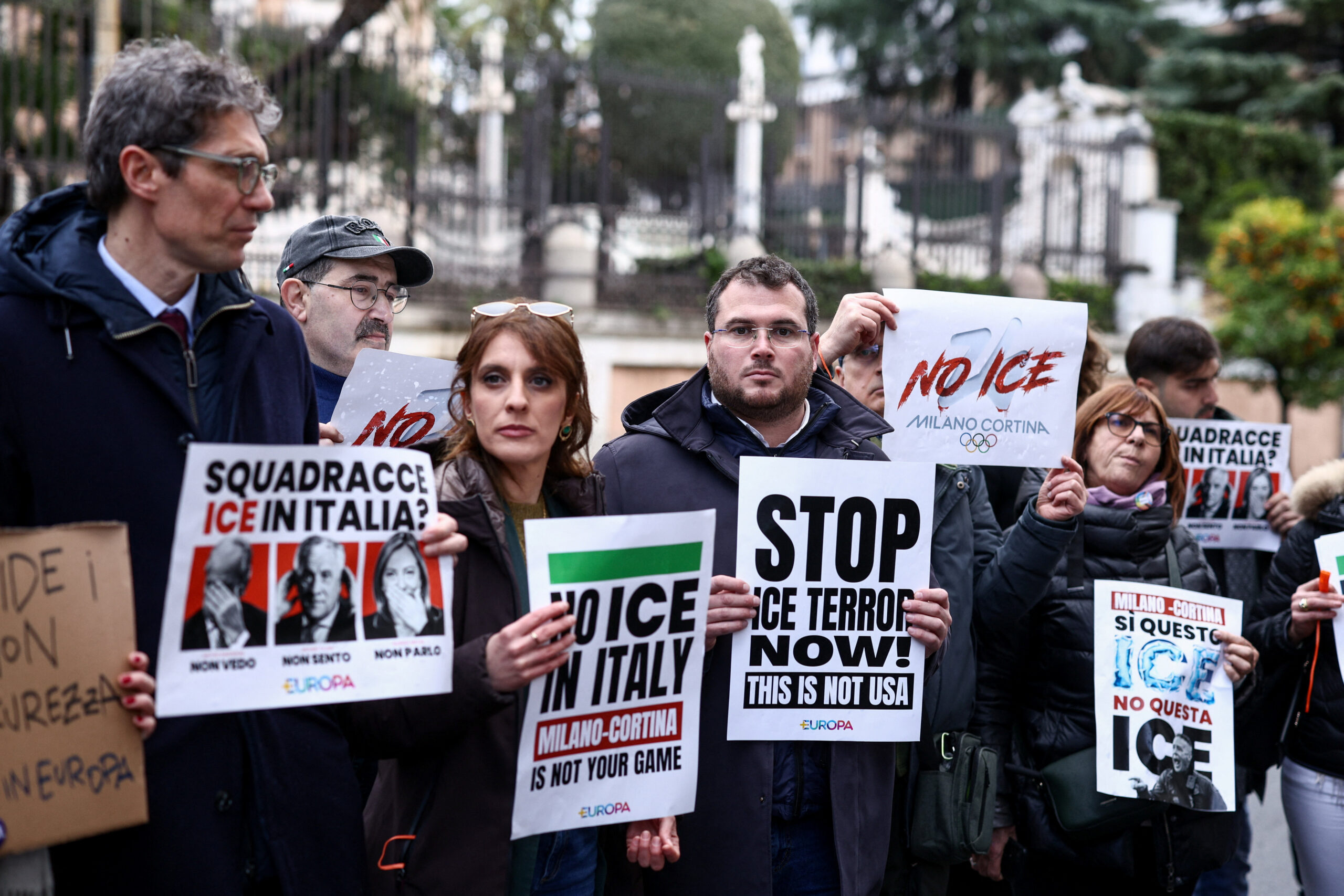 Un grupo de manifestantes en Roma, convocados por el partido Más Europa, gritaron consignas y exhibieron pancartas como "No al ICE en Italia" y "Milan-Cortina no son tus Juegos", primera de una serie de movilizaciones previstas en el país contra la presencia de agentes o analistas del Servicio de Inmigración y Control de Aduanas de Estados Unidos (ICE).