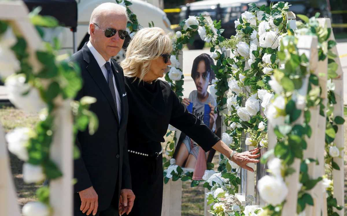 El presidente y la primera dama, Jill Biden, sollozaron mientras visitaban los monumentos conmemorativos de la escuela primaria Robb, donde el tirador mató a 19 estudiantes y dos profesores, depositando rosas blancas y presentando sus respetos en santuarios improvisados para las víctimas.