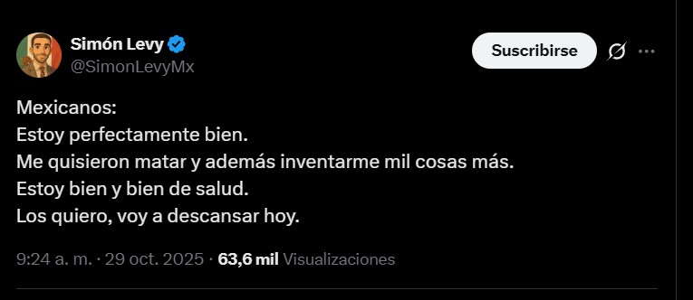 Mexicanos: Estoy perfectamente bien. Me quisieron matar y además inventarme mil cosas más. Estoy bien y bien de salud. Los quiero, voy a descansar hoy.