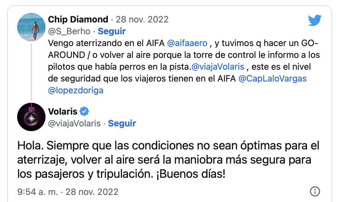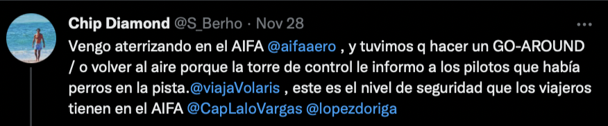 “Vengo aterrizando en el AIFA, y tuvimos q hacer un GO-AROUND / o volver al aire porque la torre de control le informó a los pilotos que había perros en la pista”.