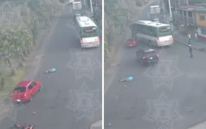 Después de la colisión, se ve cómo el vehículo rodea al hombre tirado en el pavimento y acelera. Sin embargo, su fuga se ve frustrada cuando un camión de pasajeros le cierra el paso.