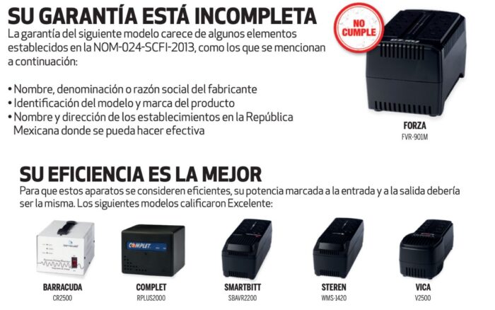 La Profeco alertó sobre irregularidades detectadas en la documentación de los modelos Forza FVR-901M (regulador) y Forza NT-511 series (no-break), ya que presentan una “garantía incompleta” al contravenir la NOM-024-SCFI-2013.