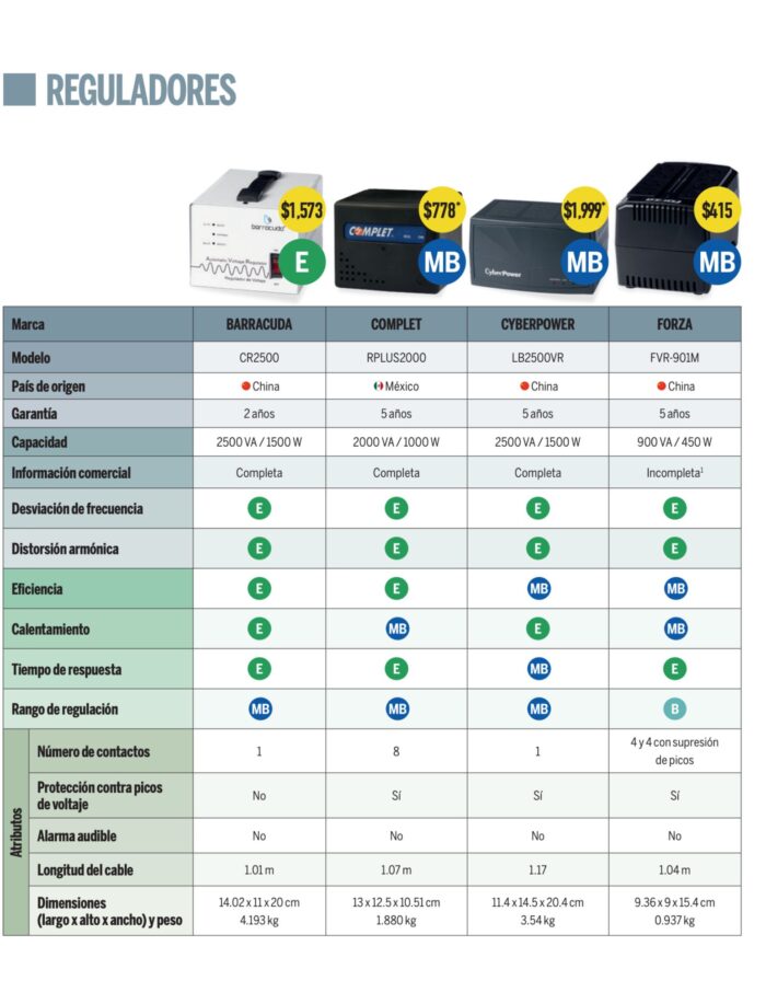 En el segmento de los reguladores, las marcas Barracuda (CR2500), Smartbitt (SBAVR2200) y Vica (V2500) destacaron al obtener una calificación de Excelente (E) en la mayoría de los rubros evaluados.