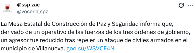 La Mesa Estatal de Construcción de Paz y Seguridad de Zacatecas informó que un enfrentamiento entre fuerzas de seguridad y civiles armados dejó como saldo una persona muerta y dos mujeres lesionadas, durante un operativo realizado en la comunidad de Tayahua, en el municipio de Villanueva.