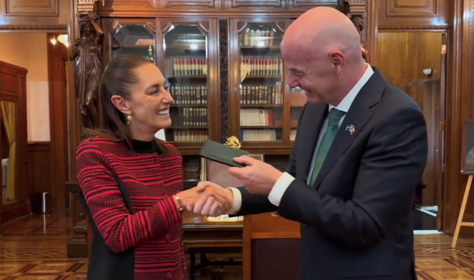 La mandataria mexicana recibió a Gianni Infantino, presidente de FIFA, en Palacio Nacional, donde revisaron los avances en infraestructura, movilidad y programas de cara a la Copa del Mundo; el directivo italo-suizo obsequió a la presidenta un juego de tarjetas amarilla y roja que usarán los árbitros durante la próxima justa mundialista.
