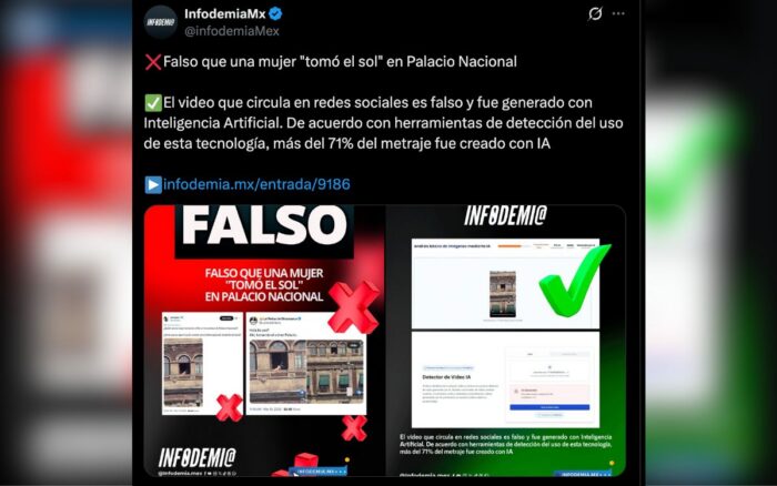 En el caso más reciente, Infodemia MX clasificó como falso el video de una persona tomando el sol en Palacio Nacional, alegando el uso de Inteligencia Artificial. El clip original fue publicado el 19 de marzo por el creador de contenido Vampipe. Tras el primer “desmentido”, se publicaron más ángulos del momento, pese a lo cual el SPR mantuvo la postura de que todo era falso.