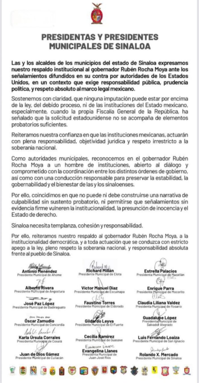 Al menos 18 presidentas y presidentes municipales de Sinaloa —de 20 alcaldías— dieron su respaldo institucional al gobernador Rubén Rocha Moya, tras los señalamientos de autoridades de Estados Unidos que lo vinculan, junto con otros nueve funcionarios y exfuncionarios, a presuntas actividades relacionadas con el narcotráfico.