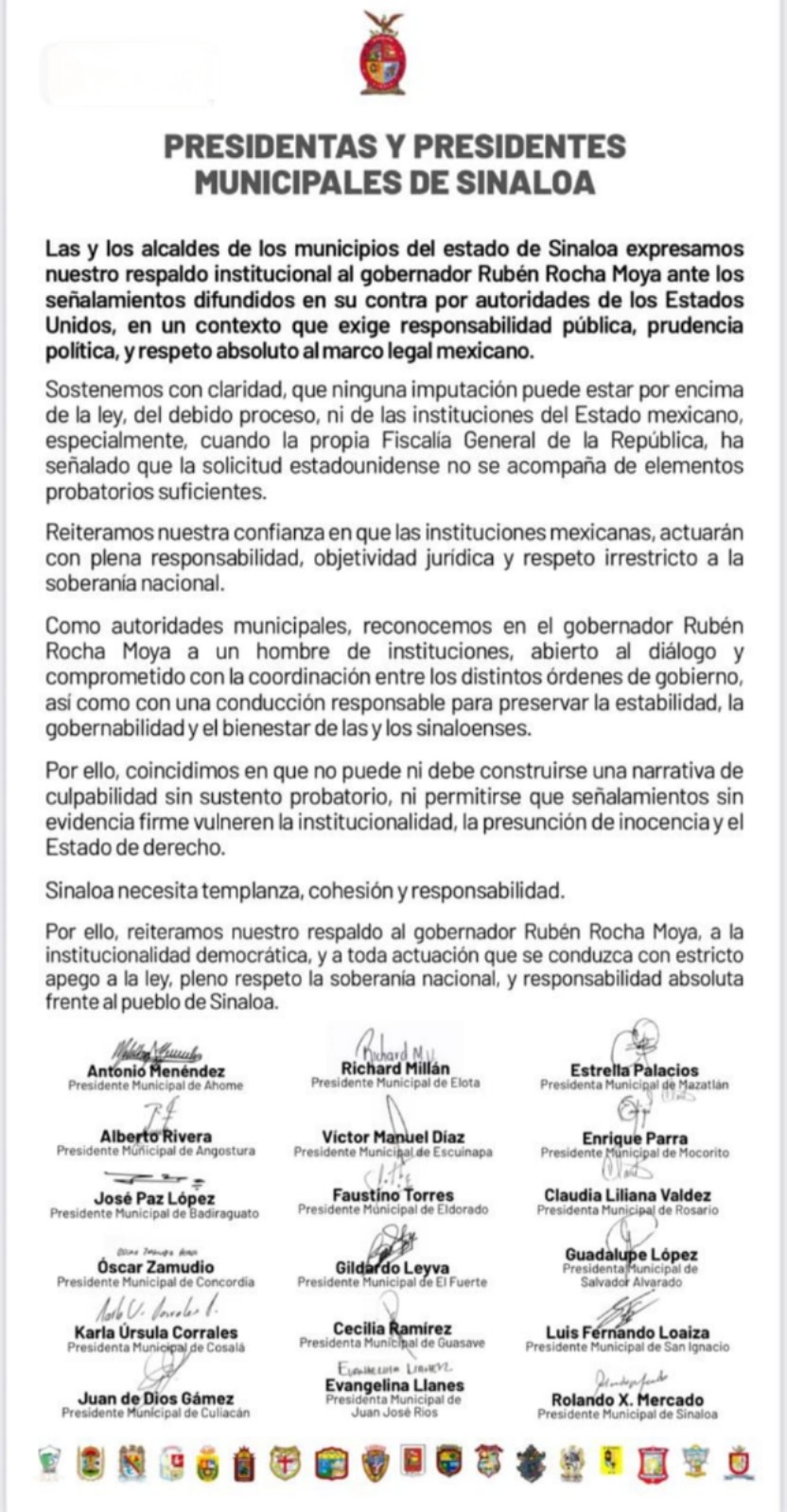Los firmantes fueron los alcaldes de los municipios de Ahome, Angostura, Badiraguato, Concordia, Cosalá, Culiacán, Elota, Escuinapa, Eldorado, El Fuerte, Guasave, Juan José Ríos, Mazatlán, Mocorito, Rosario, Salvador Alvarado, San Ignacio y Sinaloa.