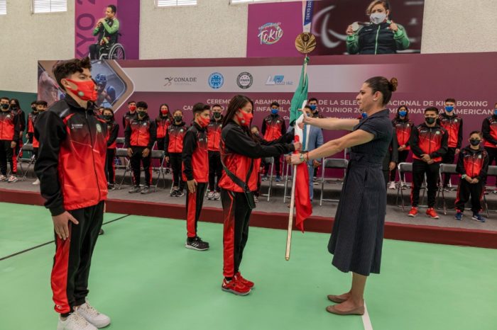 La directora general de la #CONADE @AnaGGuevara, encabeza la 𝗖𝗲𝗿𝗲𝗺𝗼𝗻𝗶𝗮 𝗱𝗲 𝗔𝗯𝗮𝗻𝗱𝗲𝗿𝗮𝗺𝗶𝗲𝗻𝘁𝗼 𝗱𝗲 𝗹𝗮 𝗦𝗲𝗹𝗲𝗰𝗰𝗶ó𝗻 𝗡𝗮𝗰𝗶𝗼𝗻𝗮𝗹 𝗱𝗲 #Kickboxing rumbo al Campeonato Mundial Infantil, Cadetes y Junior en Italia, y el Panamericano con sede en Brasil. pic.twitter.com/pltXn8matn