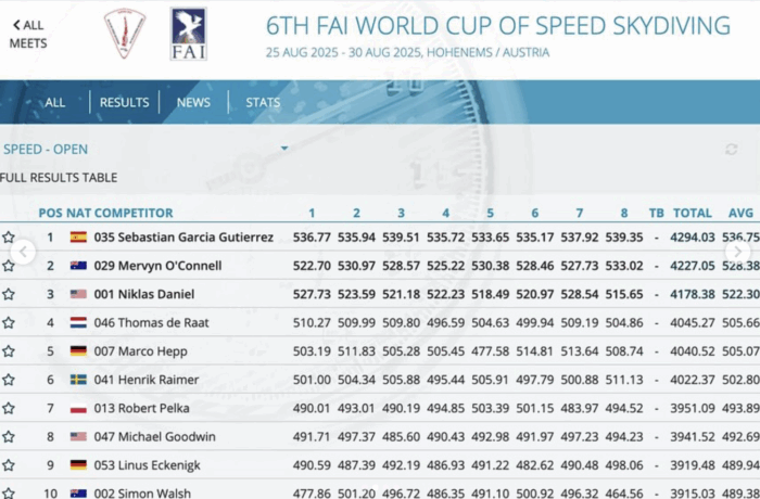 El promedio de velocidad alcanzada en los últimos tres segundos del salto, antes de llegar a los 5 mil 600 pies, 1.7 kilómetros del suelo, luego de 8 rondas de saltos, marca al ganador de la competencia y el paracaidista mexicano logró en la justa austriaca un nuevo récord mundial al alcanzar los 539.51 km/h. Uno de los tres récords mundiales que impuso en esa ocasión.