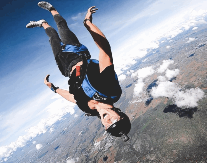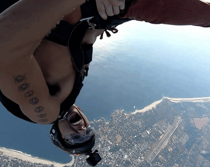 “El primer salto, por ejemplo, vas con dos instructores. Tú ya traes tu propio paracaídas, pero cada uno de los instructores va al lado tuyo en caso de que no tengas control o te apaniques o cualquier cosa. Ellos están ahí para ayudarte.