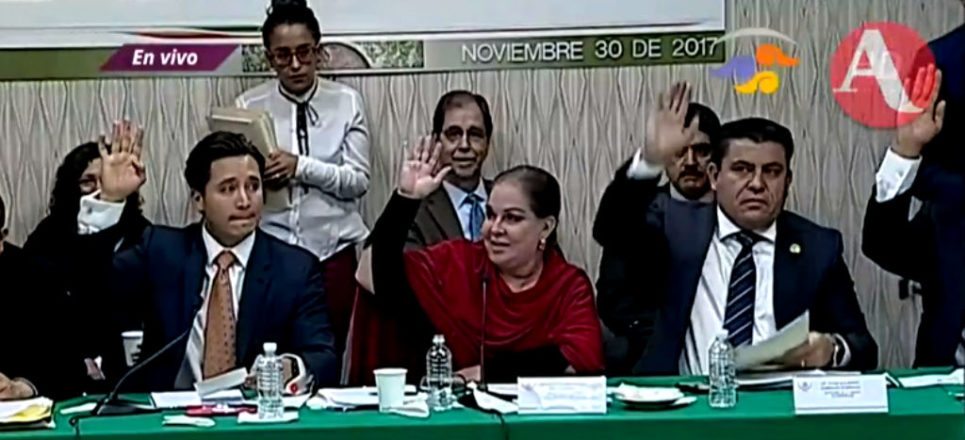 El documento fue aprobado con los 17 votos del PRI, Partido Verde y Nueva Alianza, a los que sumó de manera sorpresiva la legisladora del PAN, Claudia Sánchez Juárez, diputada plurinominal de Huixquilucan, Estado de México.