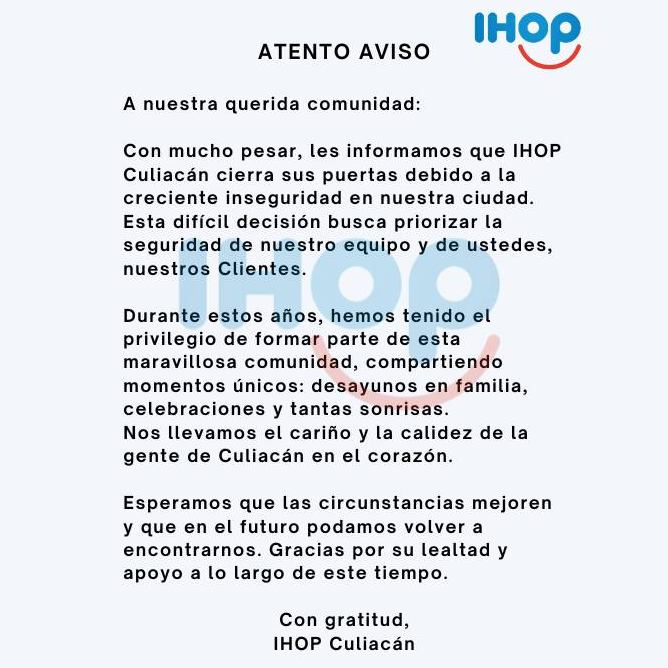 La cadena de restaurantes IHOP anunció que cerrará su sucursal en Culiacán, Sinaloa, ante la inseguridad que padece la región.