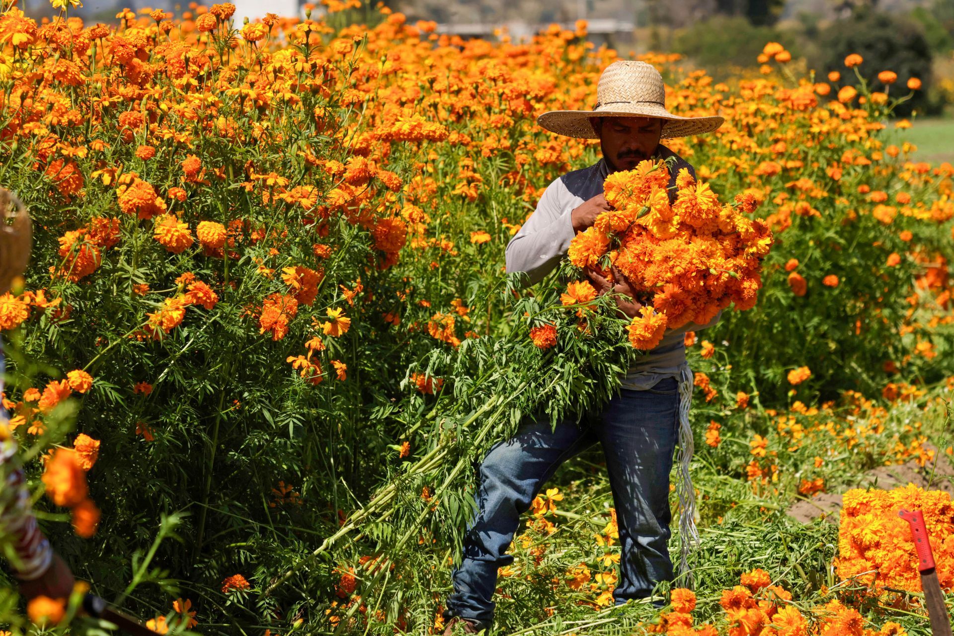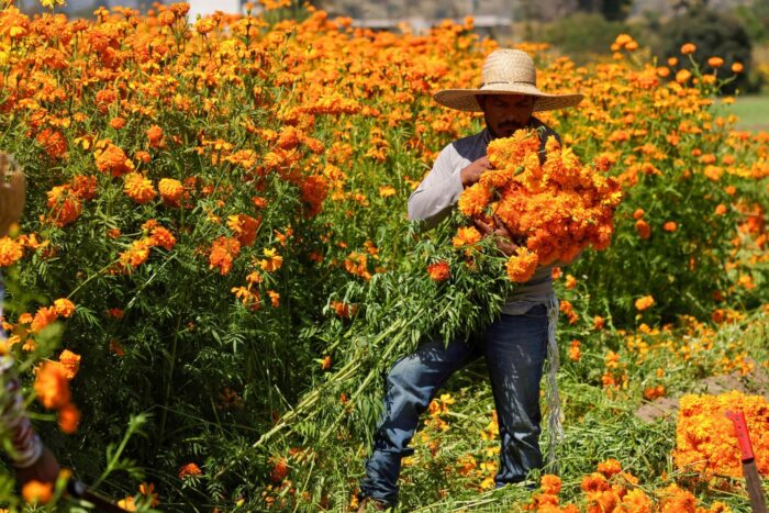 En largas jornadas y con un cuchillo curvo, los trabajadores cortan y eligen las mejores flores, aquellas que no estén maltratadas, ya que su objetivo será adornar las ofrendas o altares donde se coloca la comida y los objetos favoritos de las personas fallecidas a las que se honrará su memoria este fin de semana, como marca la tradición en el país norteamericano.