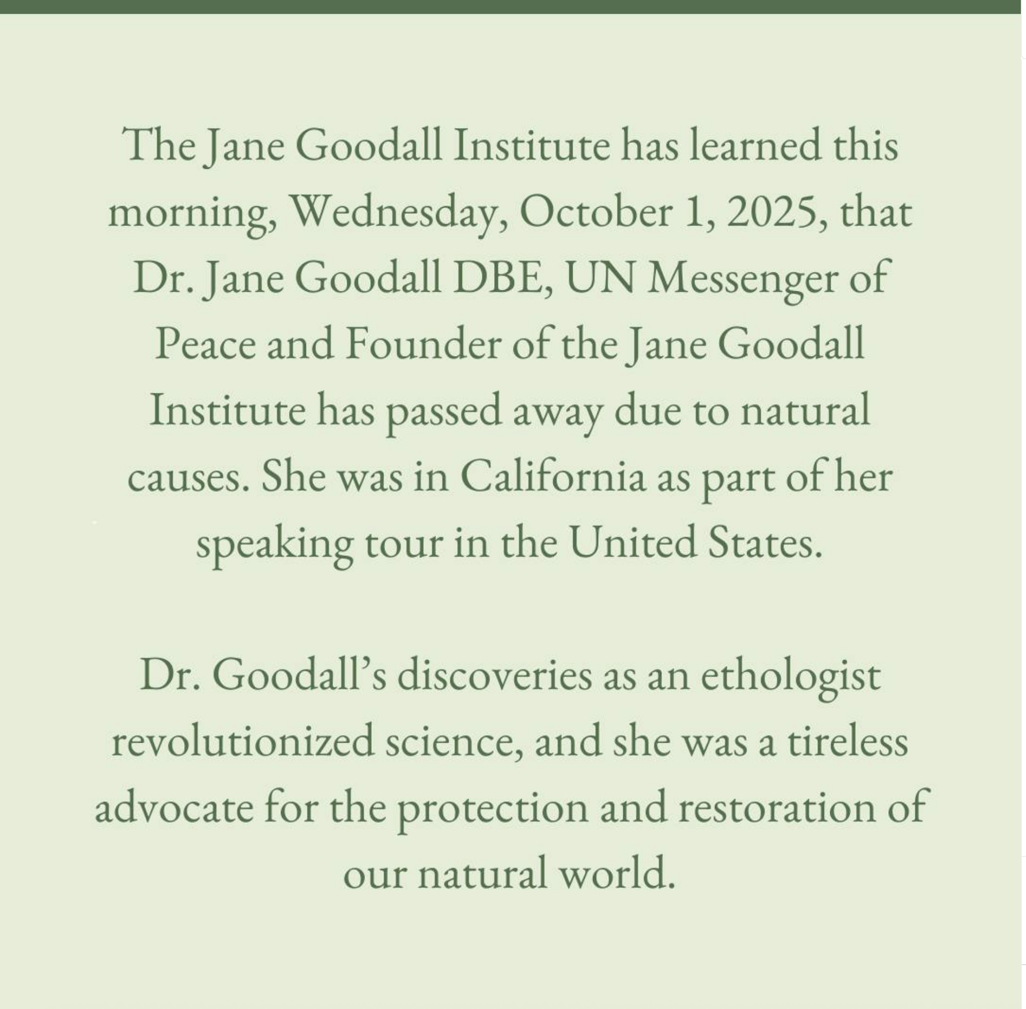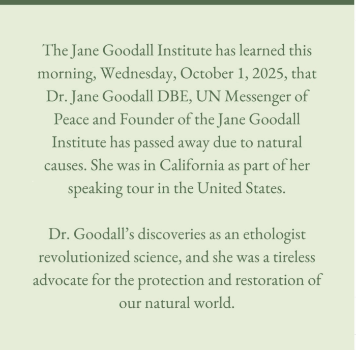 Su partida deja un vacío profundo en el mundo de la ciencia y la conservación. Jane Goodall no solo estudió chimpancés; transformó la relación del ser humano con la naturaleza y nos recordó nuestra responsabilidad con todas las especies que comparten el planeta.