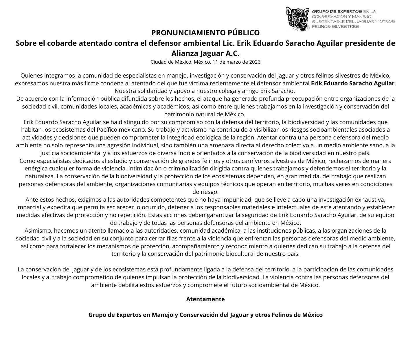 Asimismo, la organización Alianza Jaguar A.C., que encabeza Saracho, también condenó el atentado y en un pronunciamiento firmado por especialistas en conservación del jaguar y otros felinos silvestres de México, expresaron su solidaridad con el defensor ambiental y manifestaron preocupación por la violencia contra quienes trabajan en la protección del territorio y la biodiversidad.