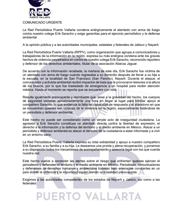 La Red Periodística Puerto Vallarta (RPPV) condenó el atentado con arma de fuego contra el periodista y defensor ambiental Erik Saracho, ocurrido la mañana de este 11 de marzo.