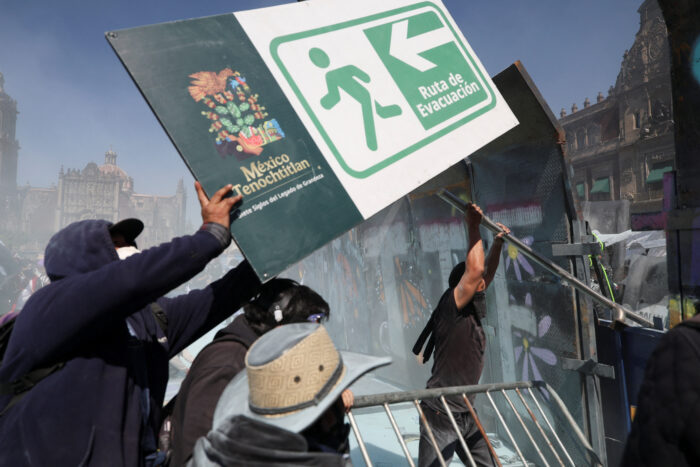 El recorrido inició en el Ángel de la Independencia de forma pacífica y terminó en la plaza más grande del país, donde el “bloque negro” de la marcha golpeó con martillos y piedras las vallas que resguardaban el Palacio Nacional hasta derribarlas.