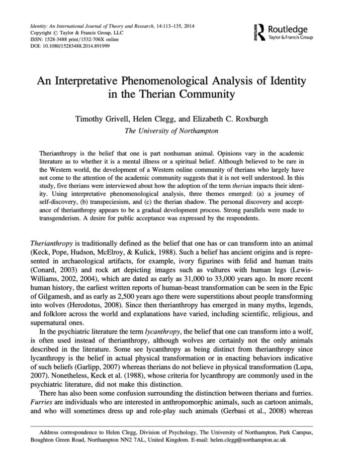 Un estudio realizado en 2014 por investigadores de la Universidad de Northampton, titulado Un análisis fenomenológico interpretativo de la identidad en la comunidad Therian, arrojó desde hace más de una década una visión que desafía la postura psiquiátricas tradicional que a menudo cataloga a la identidad Therian simplemente como patología.