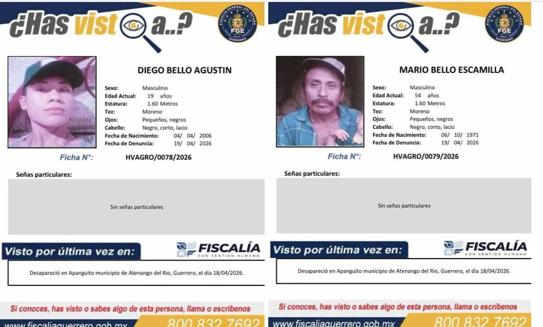 Siete hombres fueron reportados como desaparecidos en el municipio de Atenango del Río, aunque la Fiscalía General del Estado de Guerrero hasta ahora ha emitido fichas de búsqueda para cuatro de ellos.