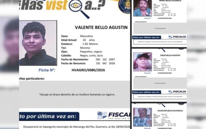 Las personas que cuentan con denuncia y ficha de búsqueda son: Mario Bello Escamilla, de 54 años; Diego Bello Agustín, de 19; Asunción Bello Escamilla, de 41, y Valente Bello Agustín, de 18, quien como seña particular presenta un tatuaje en el brazo derecho con la figura de un muñeco fumando.