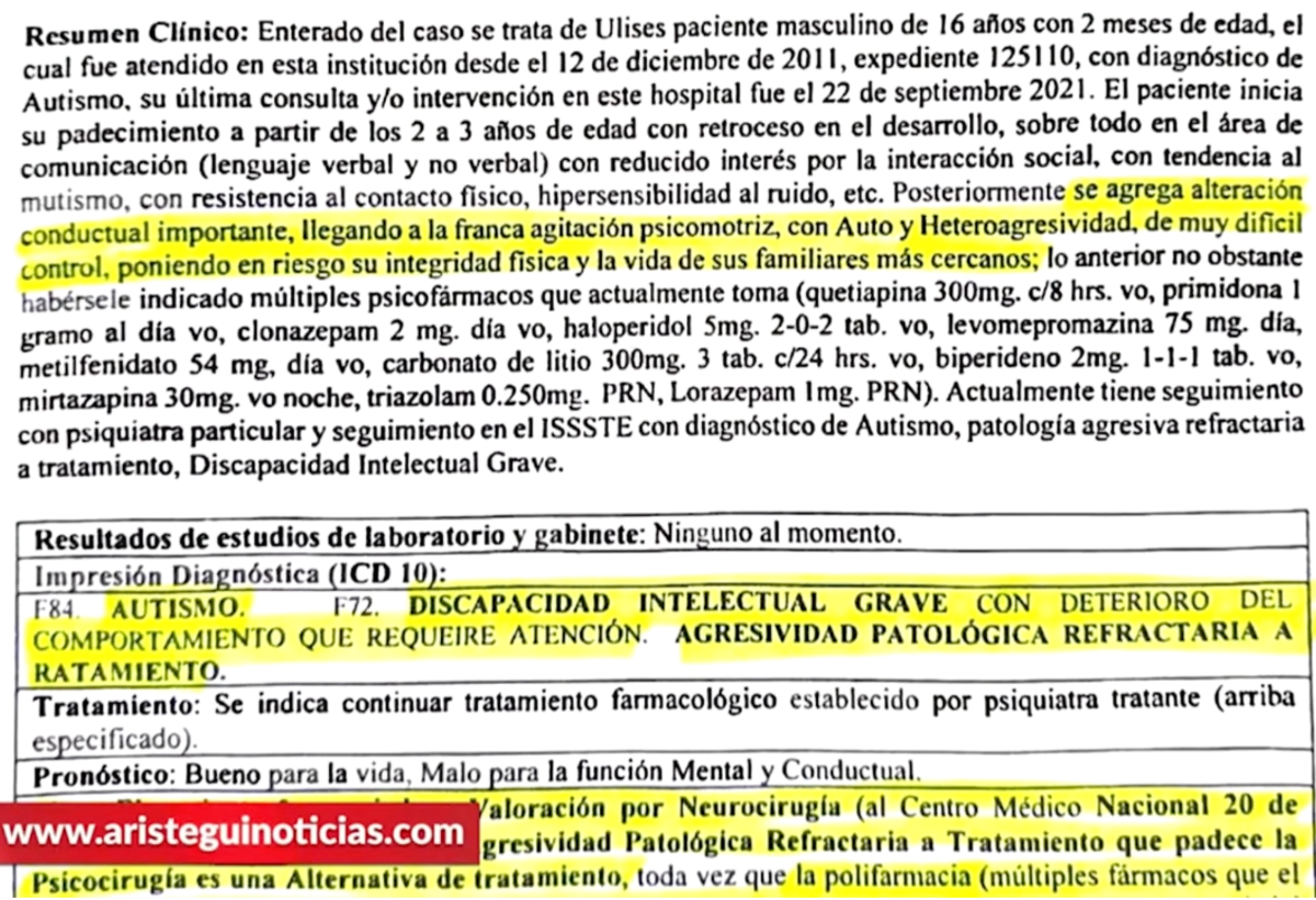 Explicó que la neurocirugía es urgente ya que existe un dictamen médico en el que se reconoce que los fármacos requeridos para controlar la agresividad de los jóvenes que padecen autismo, han dejado de funcionar: