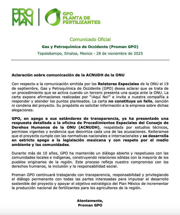 Con respecto a la comunicación emitida por los Relatores Especiales de la ONU el 19 de septiembre, Gas y Petroquímica de Occidente (GPO) desea aclarar que se trata de un procedimiento que se activa cuando un tercero presenta una queja ante la ONU.