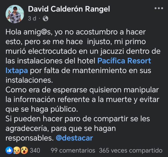 “Murió electrocutado en un jacuzzi dentro de las instalaciones del hotel Pacífica Resort Ixtapa por falta de mantenimiento. Como era de esperarse, quisieron manipular la información (…) Si pueden hacer paro de compartir, se les agradecería, para que se hagan responsables”, escribió en su cuenta personal en Facebook.