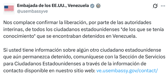 La Embajada de los Estados Unidos para Venezuela confirmó este viernes que todos los ciudadanos estadounidenses que estaban presos en Venezuela han sido liberados en pleno proceso de excarcelaciones desde Caracas y de acercamientos entre la Casa Blanca y Miraflores.